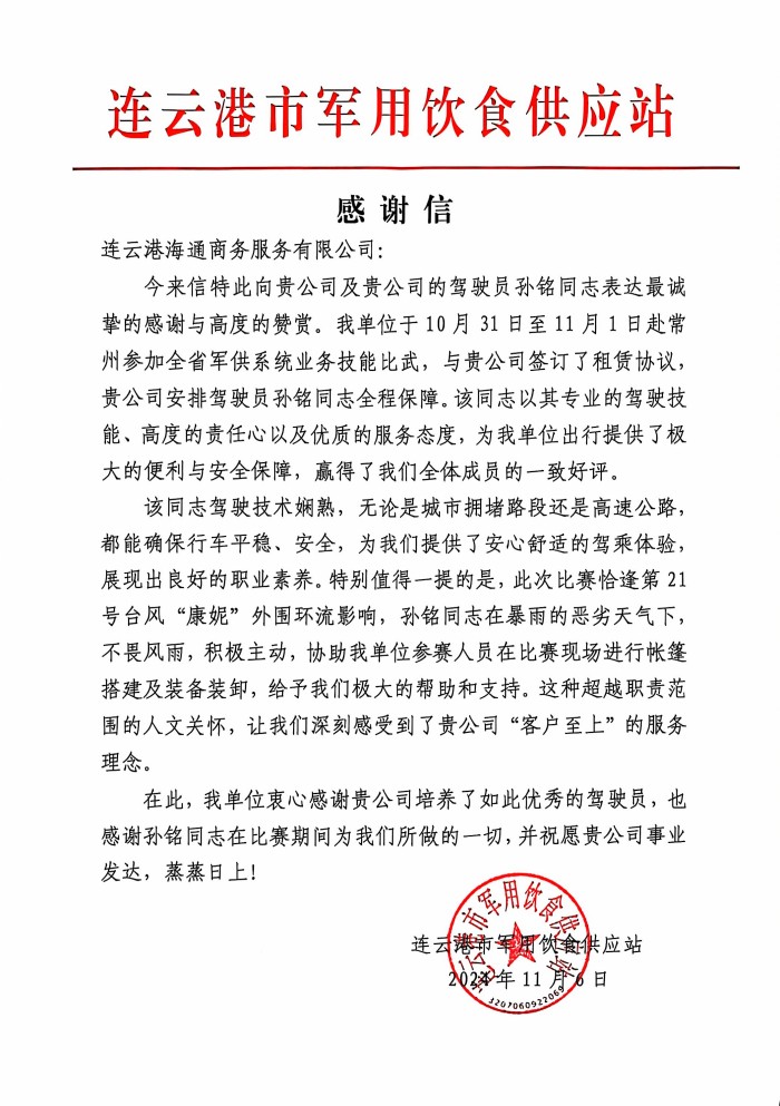 近日,汽服公司權(quán)屬汽車租賃事業(yè)部收到了一封來自連云港市軍用飲食供應(yīng)站的感謝信,信中表達(dá)了對租賃事業(yè)部政務(wù)保障車駕駛員孫銘的感謝與肯定。紙短情長,一封感謝信承載了客戶對駕駛員的信任與感激,也傳遞了汽服公司“客戶至上”的服務(wù)理念。