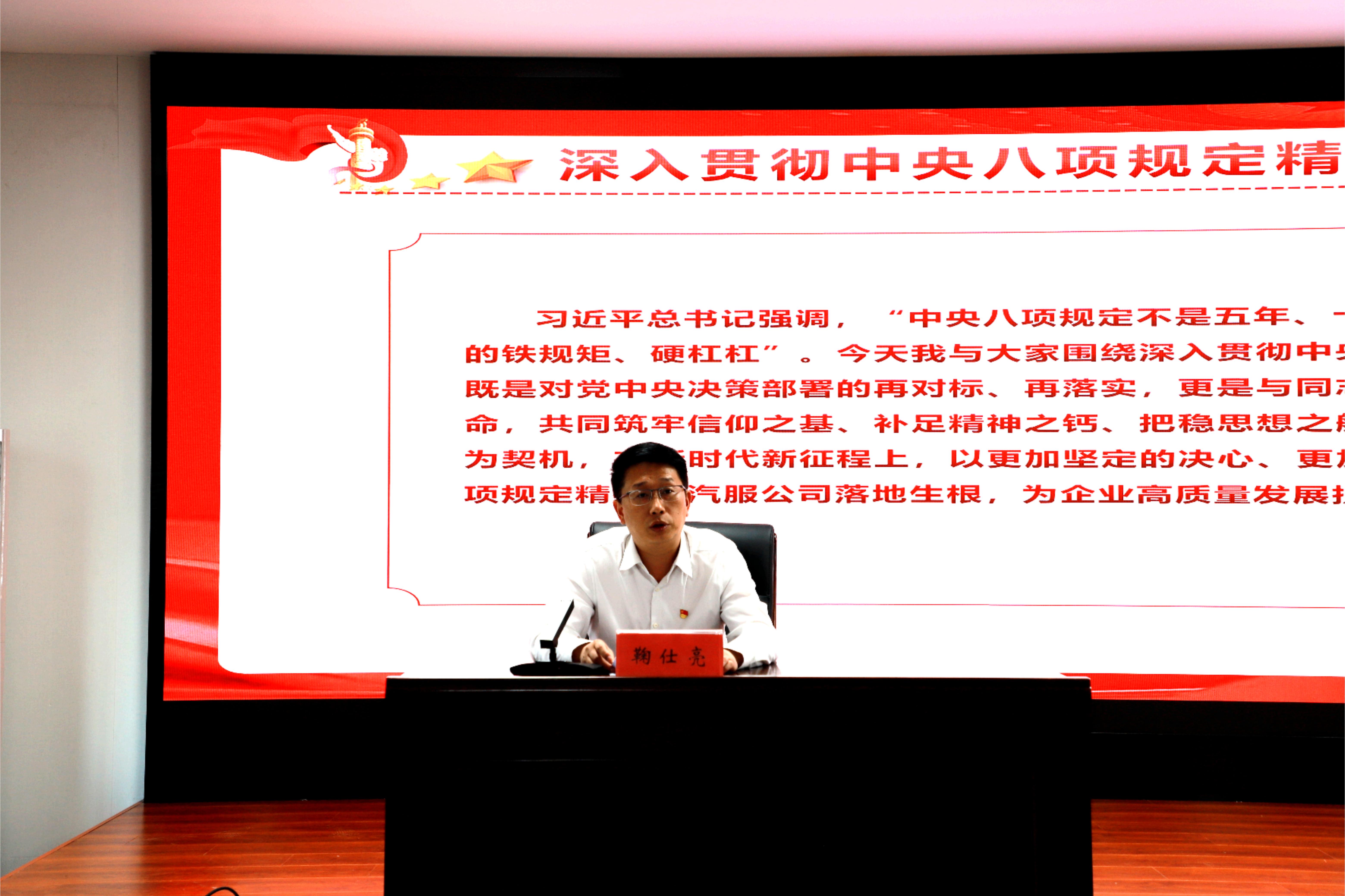 鞠仕亮作了總結講話,并以《鍥而不舍落實中央八項規(guī)定精神 以優(yōu)良作風推動汽服公司高質量發(fā)展》為題,緊密聯(lián)系公司實際,為大家上了一堂內(nèi)涵深刻的專題黨課。黨課重點從領會認識中央八項規(guī)定精神的重大意義,學習好運用好黨的十八大以來深入貫徹中央八項規(guī)定精神的成效和經(jīng)驗,鍛造企業(yè)優(yōu)良作風、凝聚汽服奮進力量推動企業(yè)高質量發(fā)展等方面進行學習交流,教育引導公司黨員干部要嚴格執(zhí)行中央八項規(guī)定及其實施細則精神,堅決守住底線、不越紅線、不碰高壓線,為公司營造風清氣正、擔當作為的干事創(chuàng)業(yè)環(huán)境。